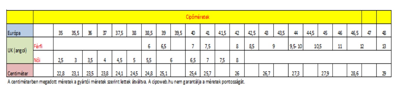 Ez a cm-ben mért érték az esetek nagy többségében nem egyforma, hiszen lábunk mérete sem feltétlenül az. Ha megvan ez az érték, akkor a táblázatból keressük ki az ahhoz legközelebb esőt, ha akkora érték nincs akkor mindig a nagyobbat válasszuk! Ez a méret a lábunk mérete!
