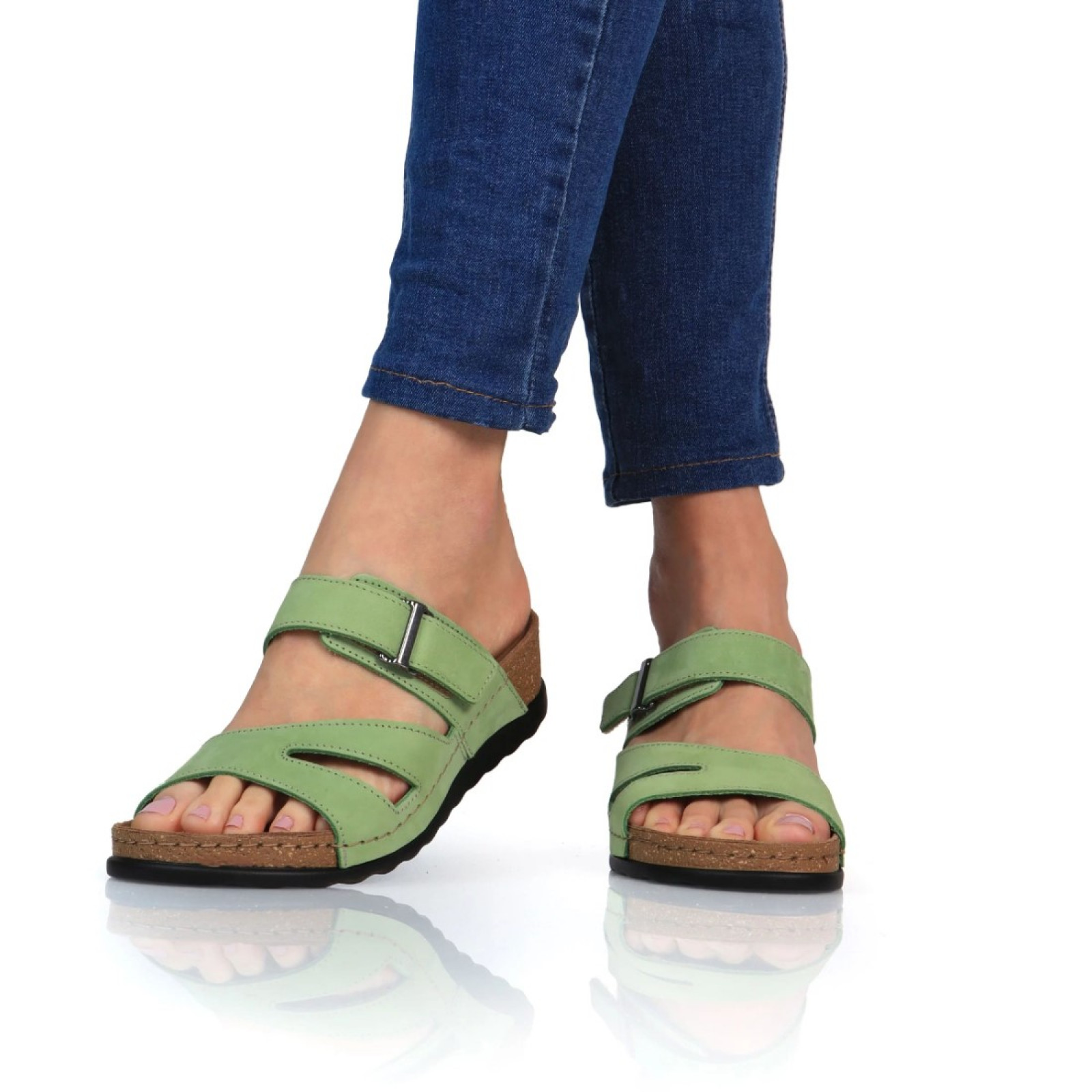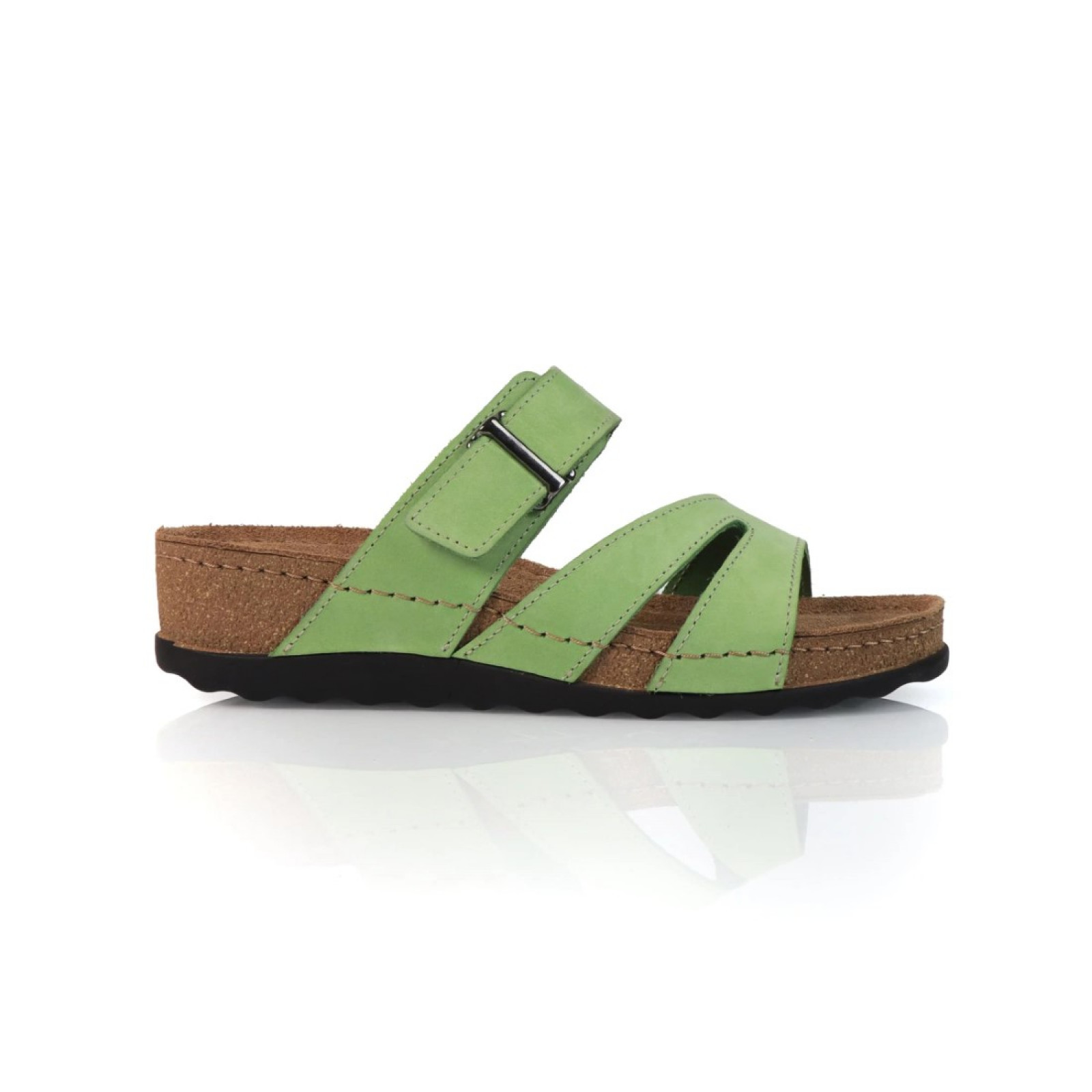 A lábbeli vidám, üde zöld árnyalata a természet frissességét idézi. Az anatómiai kialakítás és az emelt sarokrész minden lépésnél extra kényelmet biztosít. A selymes nubuk bőr felsőrész kellemes tapintású és időtálló, míg a parafa hatású talp természetes könnyedséget kölcsönöz. A felső, állítható pántnak köszönhetően tökéletesen illeszkedik a láb formájához.