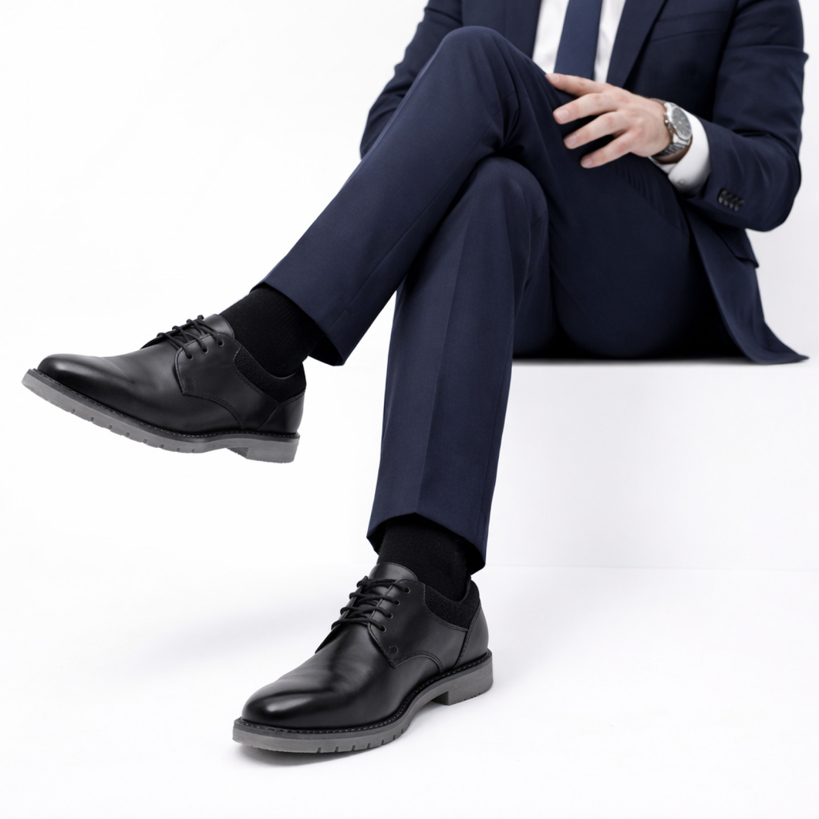 A Bugatti 315-A9G15-1000-1000 modell egy modern, elegáns férfi cipő, amely tökéletes választás üzleti megjelenéshez és alkalmi viselethez egyaránt. Letisztult formavilága és prémium anyaghasználata kifinomult megjelenést biztosít egész napos kényelem mellett. A sima, fekete felsőrész klasszikus vonalvezetésű, amelyet a boka körüli finoman texturált betét tesz különlegessé. Ez nemcsak esztétikus megoldás, hanem extra komfortot is nyújt viselés közben. A stabil, enyhén világosabb tónusú talp elegáns kontrasztot ad, miközben biztos járást és megfelelő tartást garantál. A cipő ideális választás öltönyhöz, üzleti viselethez vagy elegáns hétköznapi szettekhez.