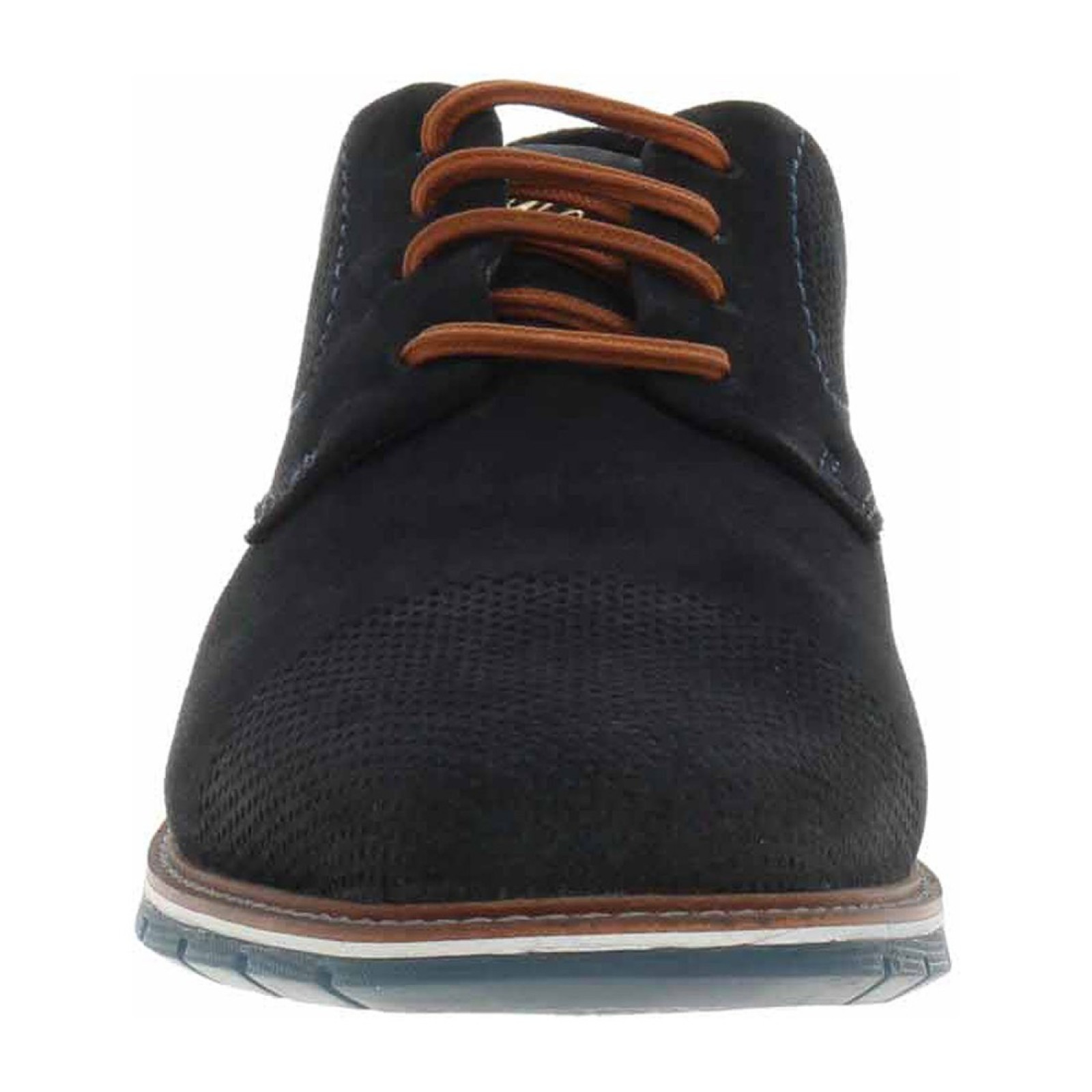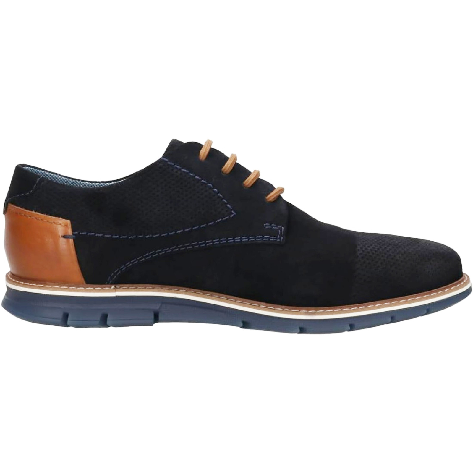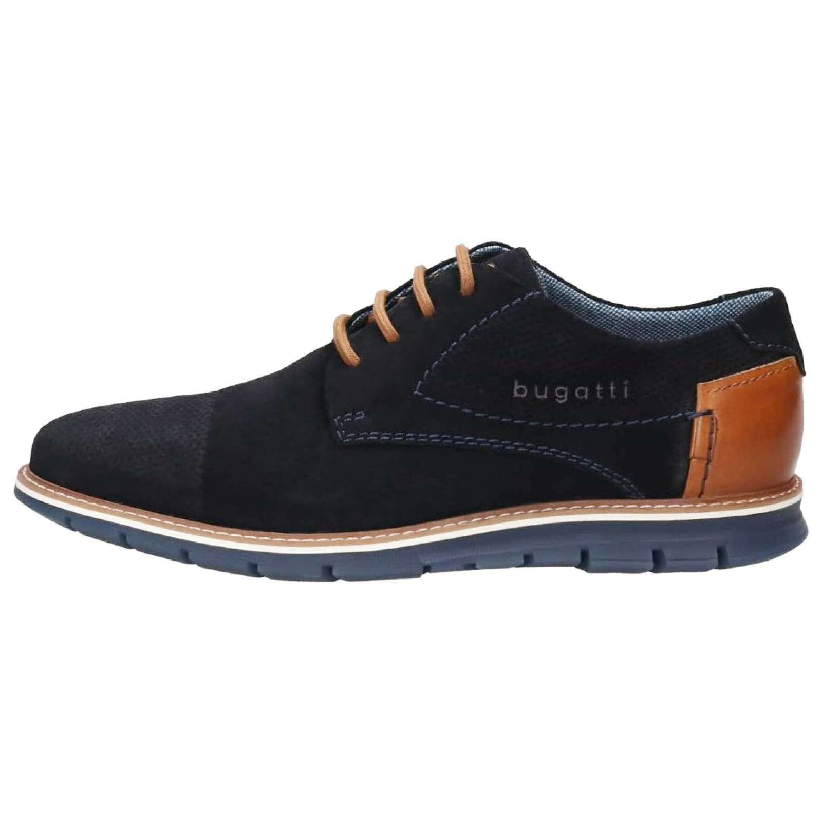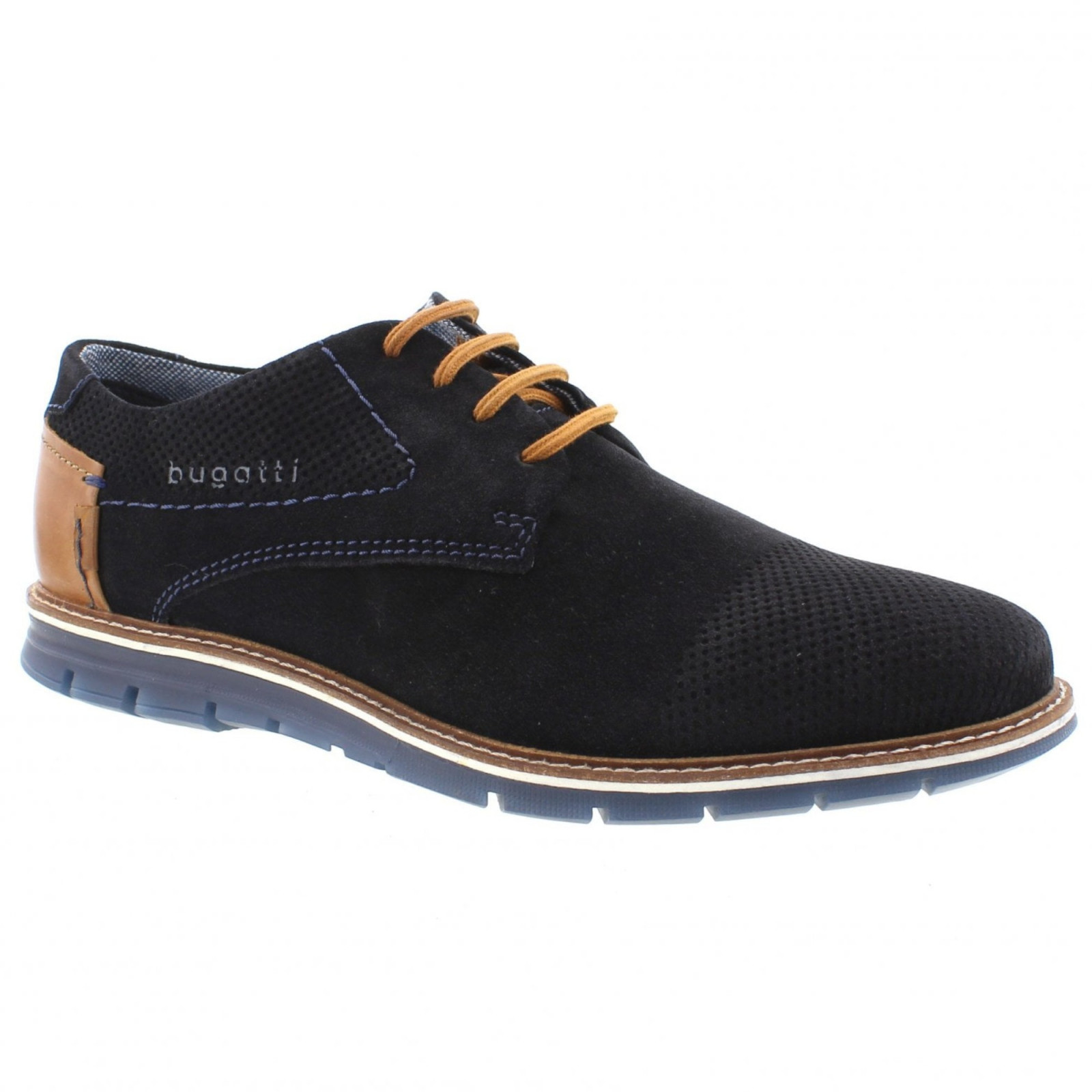 Sportos elegancia jellemzi ezt a Bugatti férfi kék bőr félcipőt. Bélése bőr és textil kombinációja. Talpbélése kivehető, és rezgéscsillapító hatású. A felsőrészre elegáns Bugatti feliratot helyeztek, a lábfejet apró öltésekkel díszítették.