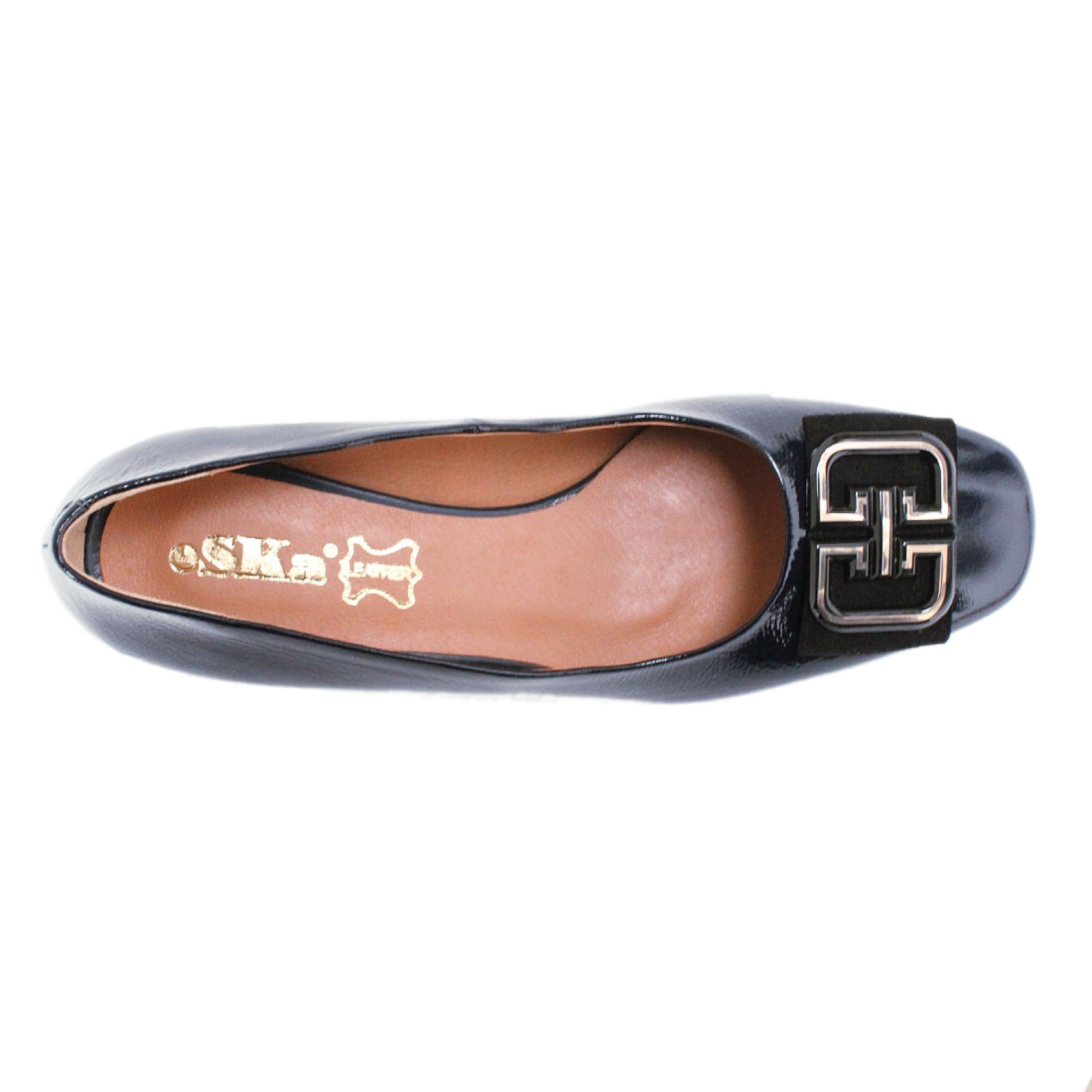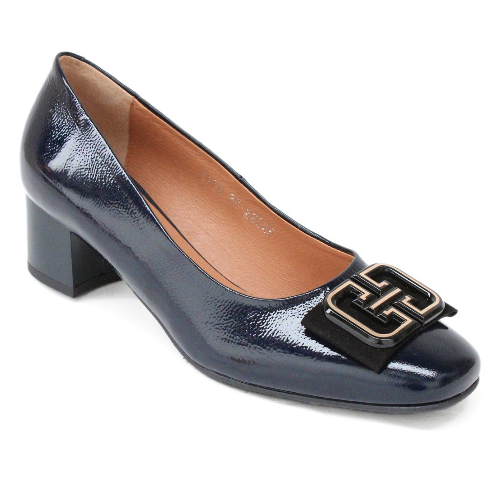 Különleges díszítésű elegáns körömcipő, melyben trendi lehetsz. 4,5 cm magas sarok, elegáns lakk felsőrész és finom vonalvezetés jellemzi ezt a modellt.